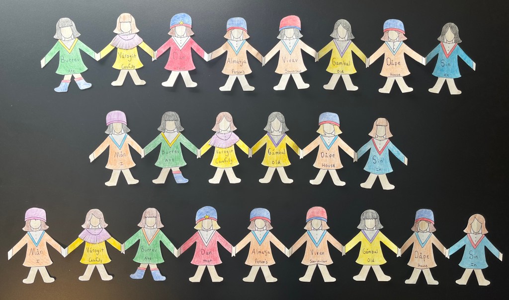 In general, Pite Sami (Uralic) has very loose word order. However, there are some constructions in which word order is strictly defined and many where word order affects the interpretation of the sentence (information structure). Eli collected samples of different word orders in the language and then used paper dolls, wearing traditional Sami clothes, to represent their variability. The color of the coat indicates part of speech, and hats and boots indicate nominal and verbal morphology, respectively.