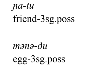Consonant gradation is a process by which a consonant changes how it is realized depending on properties of the syllable. To better understand this complex process, Hazel compared Nganansan and Finnish, two Uralic languages with slightly different manifestations of consonant gradation, in order to get a better sense of how the phenomenon manifests across the language family. Notably, unlike Finnish, Nganasan has two different processes of gradation: rhythmic and syllabic. An example of Nganasan consonant gradation is shown below; the 3SG.POSS morpheme alternates between /t/ and /ð/ based on mora count (odd vs. even moraed suffix).