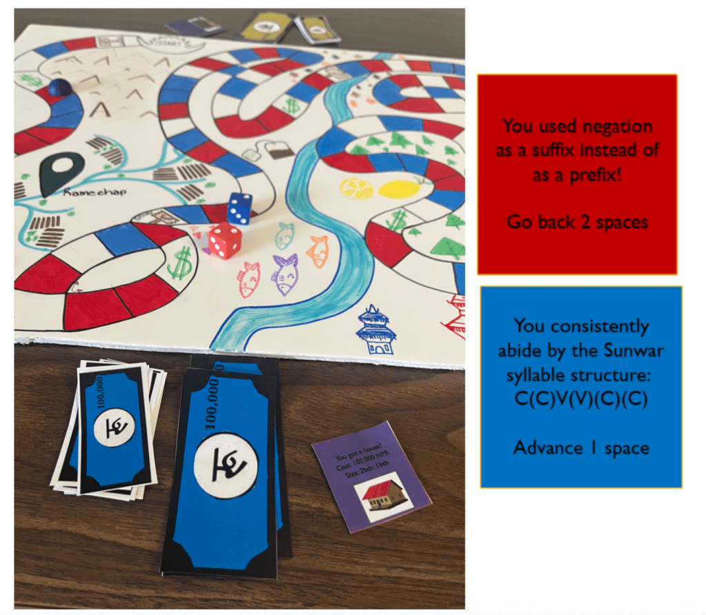Sunwar (Sino-Tibetan) is spoken primarily along the Likhu Khola river in eastern Nepal. Bringing together linguistic and cultural contexts, Katelyn created a Sunwar version of the popular Game of Life board game. Players progress through life along the Likhu Khola, building a house, raising a family, and speaking the language. Special cards reward or punish players for making grammatical mistakes or successfully picking up on phonological properties of Sunwar, as seen below.